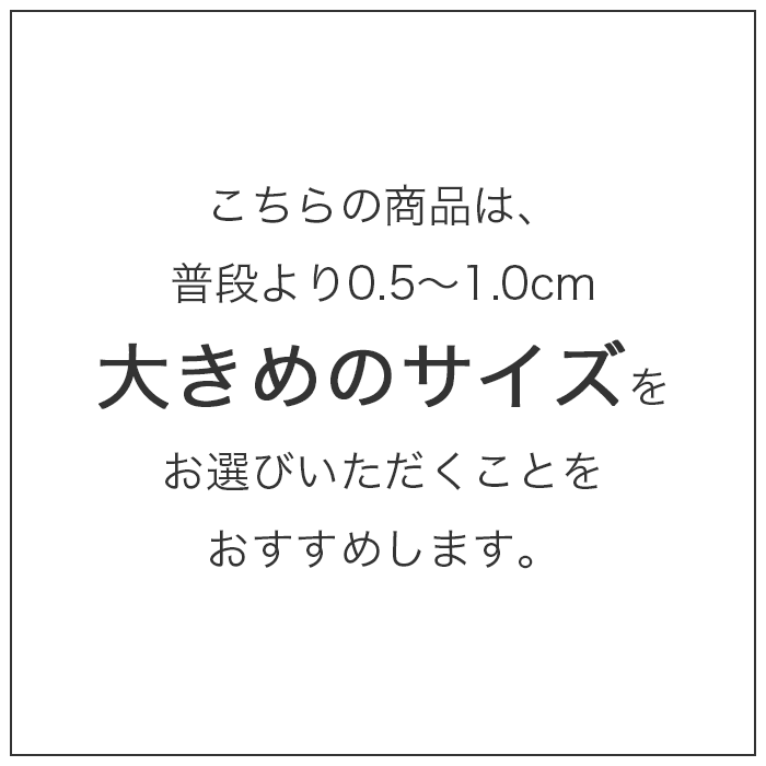 こちらの商品は、普段より0.5~1.0cm大きめのサイズをお選びいただくことをおすすめします。