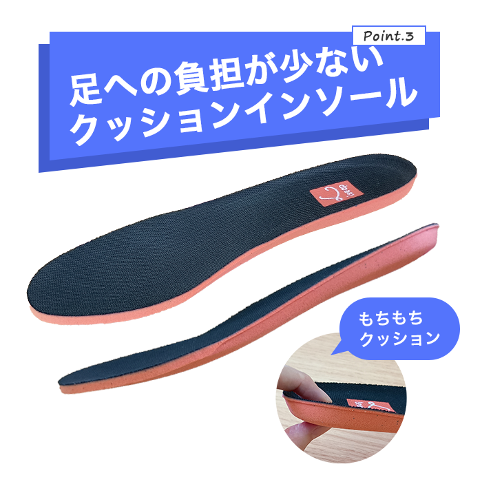 クッション性のある立体構造のインソール。もちもちとした履き心地で足への負担を和らげます。