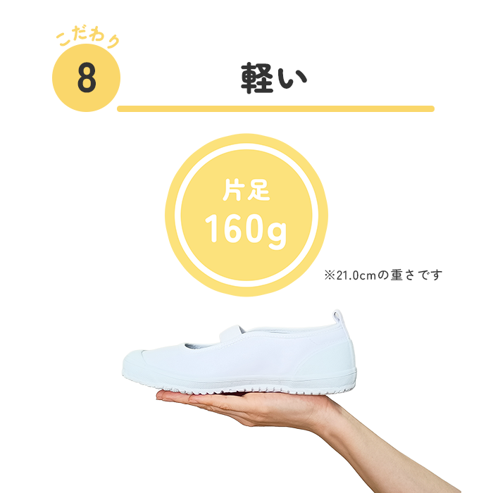 片足160g(21.0cm)と超軽量。通学時の荷物の負担も軽くなります。