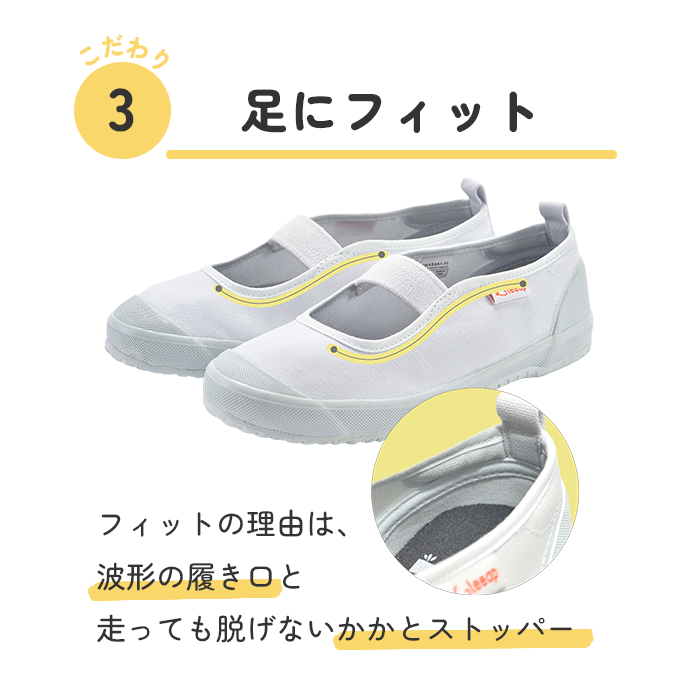 波形の履き口は足の構造にフィットします。また、かかとストッパー(かかと内側部分のクッション)は「スポスポ脱げる」のを防ぎしっかり歩くことができます。