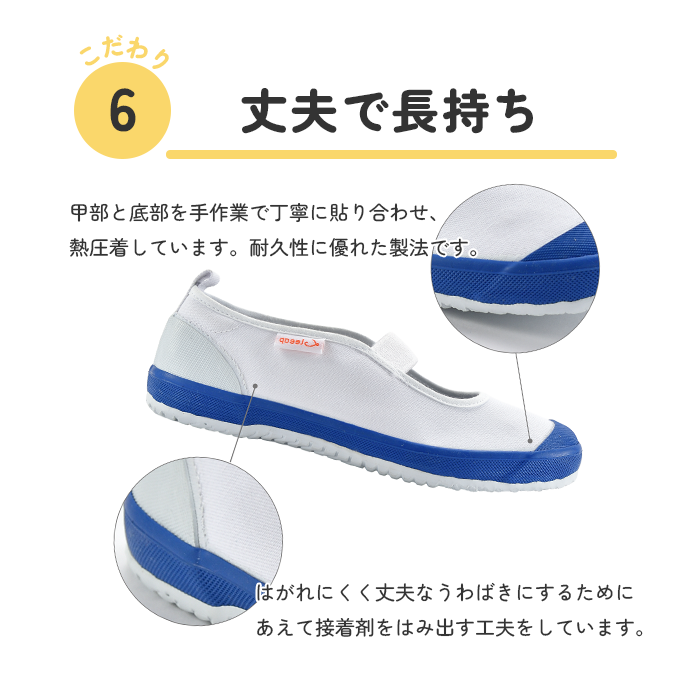 バルカナイズ製法で作られたうわばきは丈夫で長持ち。パーツを一つ一つ手作業で貼り合わせ熱圧着することで剥がれない丈夫なうわばきになります。