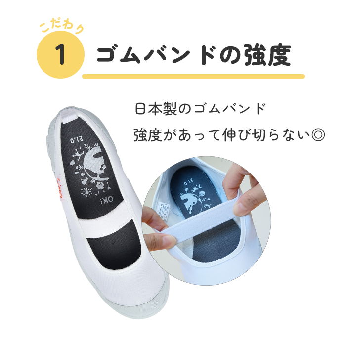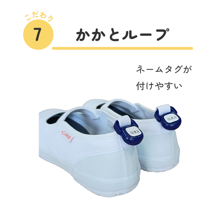 ネームタグが付けやすいようにかかとのループを大きくしました。