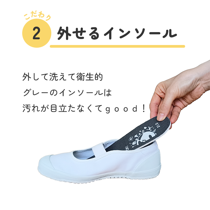 インソールは外して洗えるので清潔を保てます。濃いめのグレーで汚れが目立たないのも嬉しいポイント。