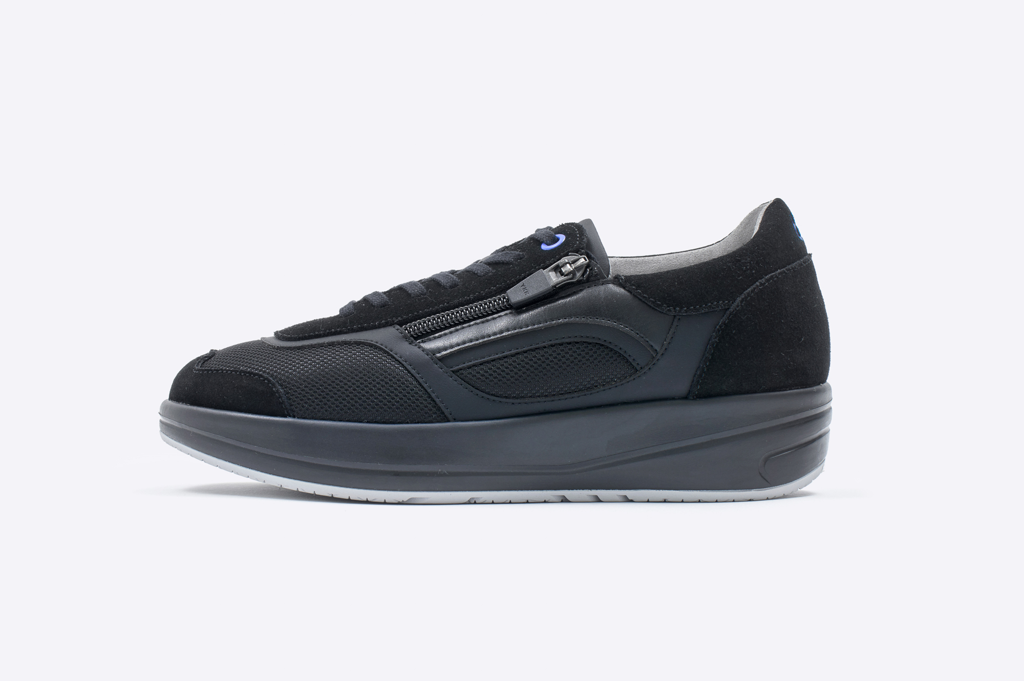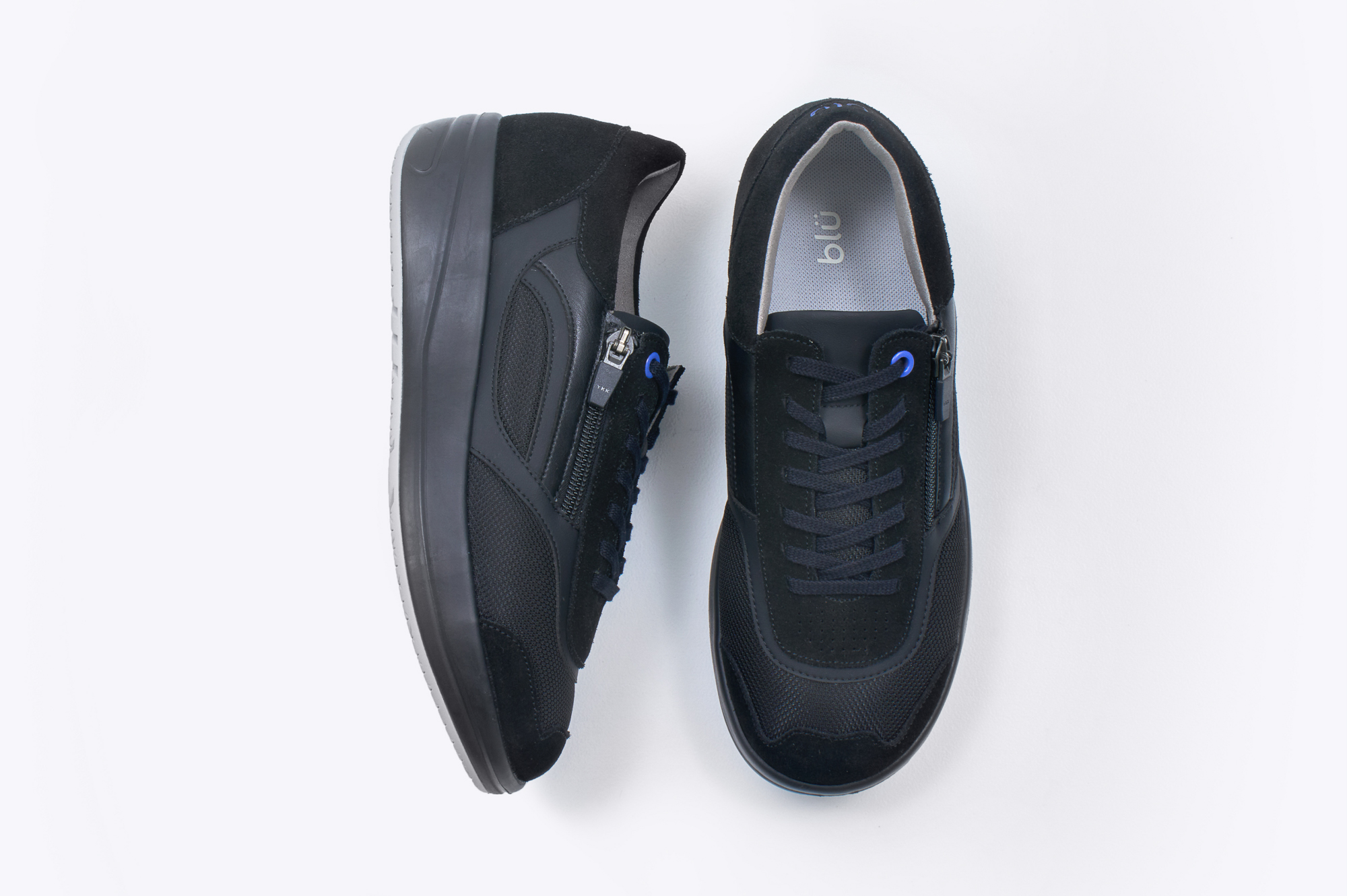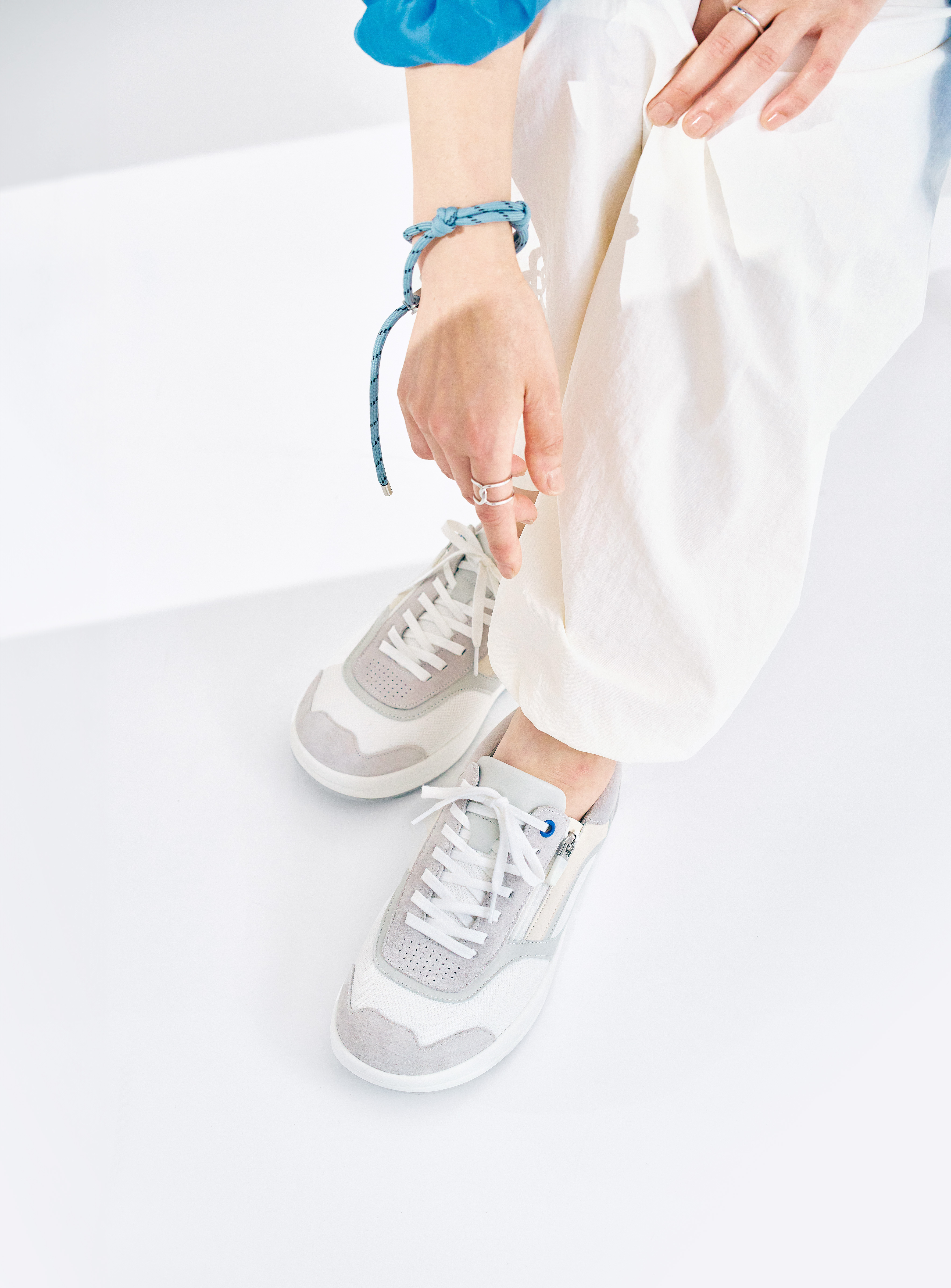靴幅の広さを感じさせず、少しずつトーンの違うパーツを組み合わせた凝った印象のデザイン。