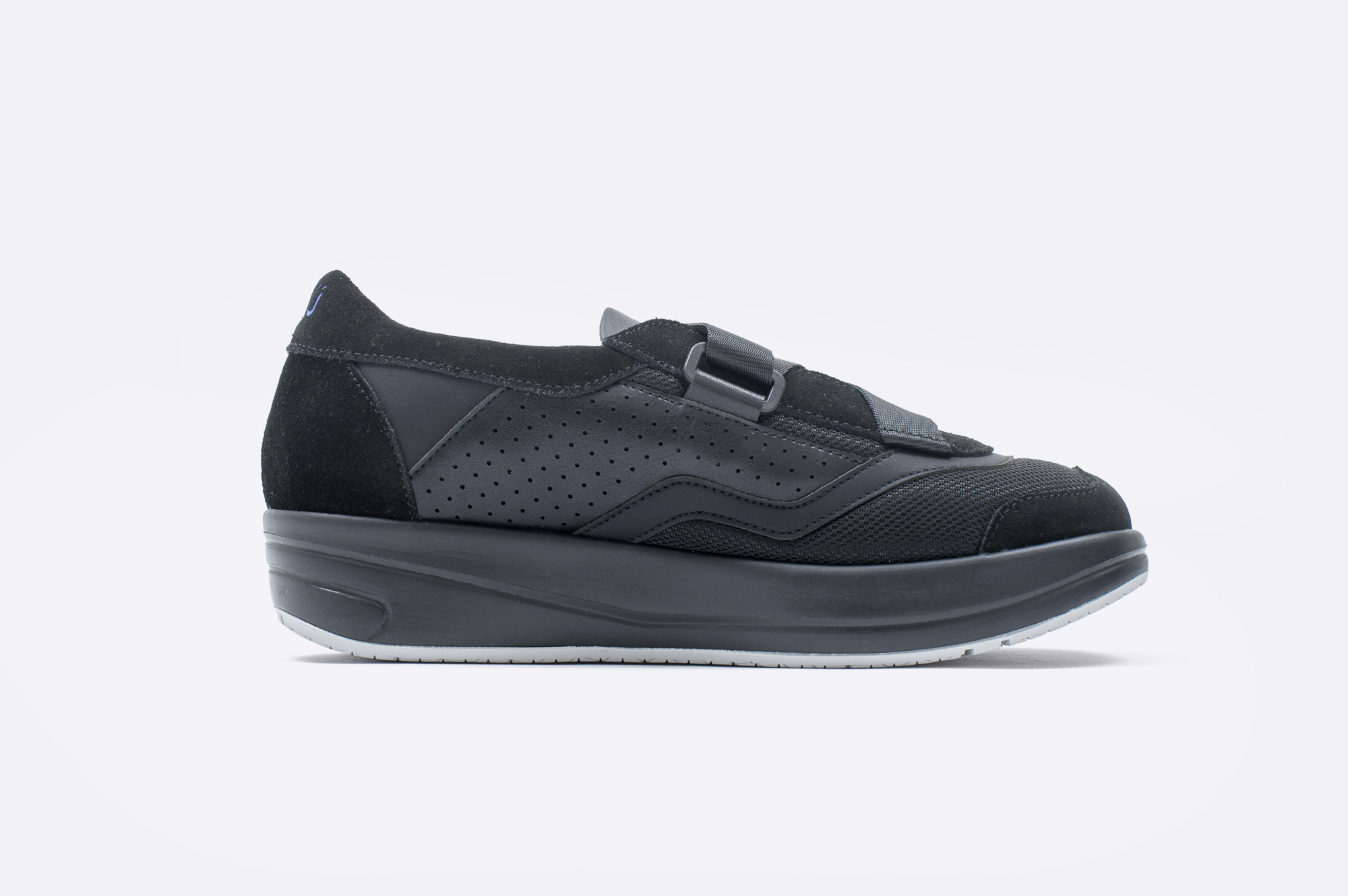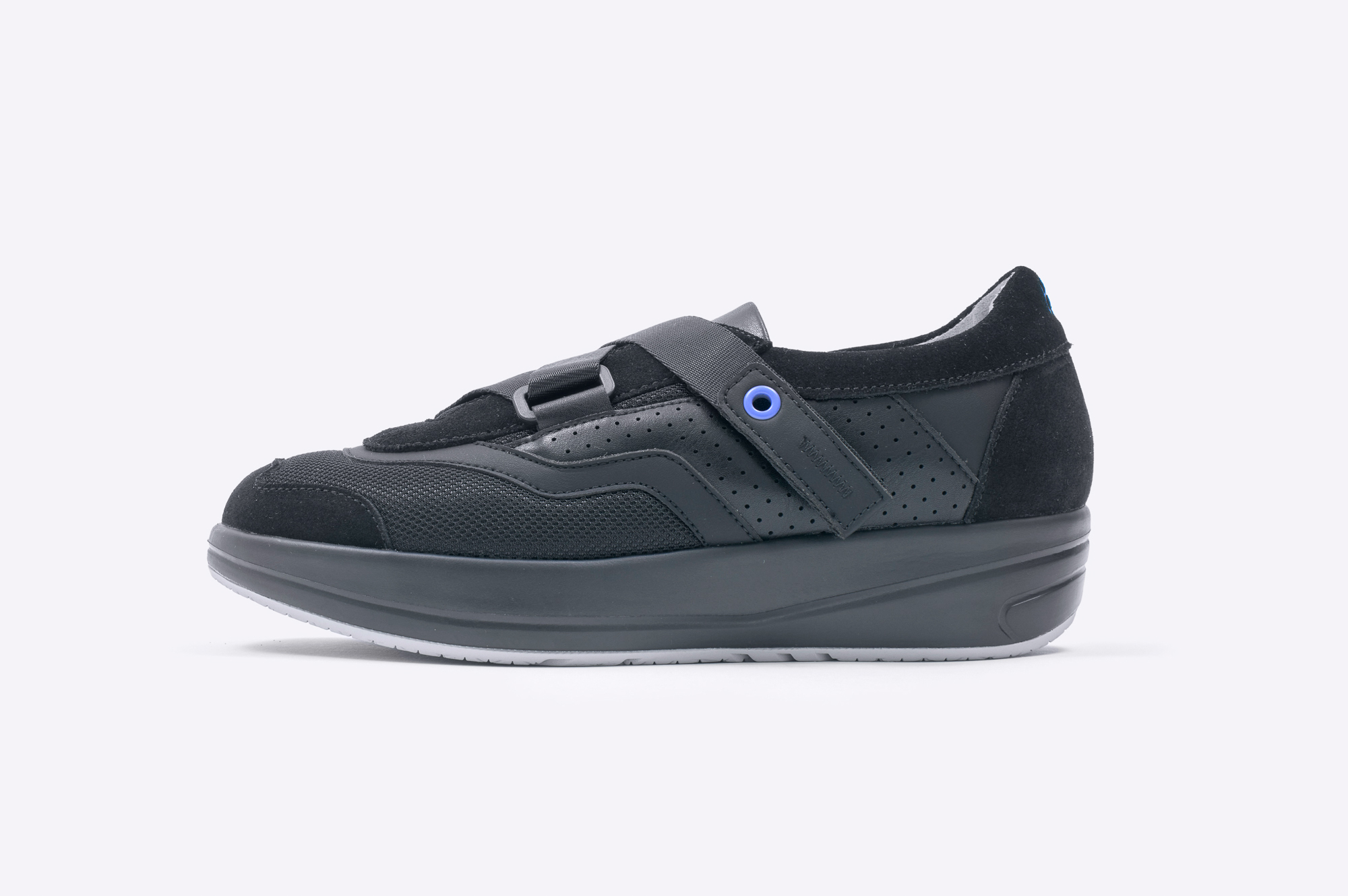 ひと続きのベルトは片足でさっと着脱可能で、