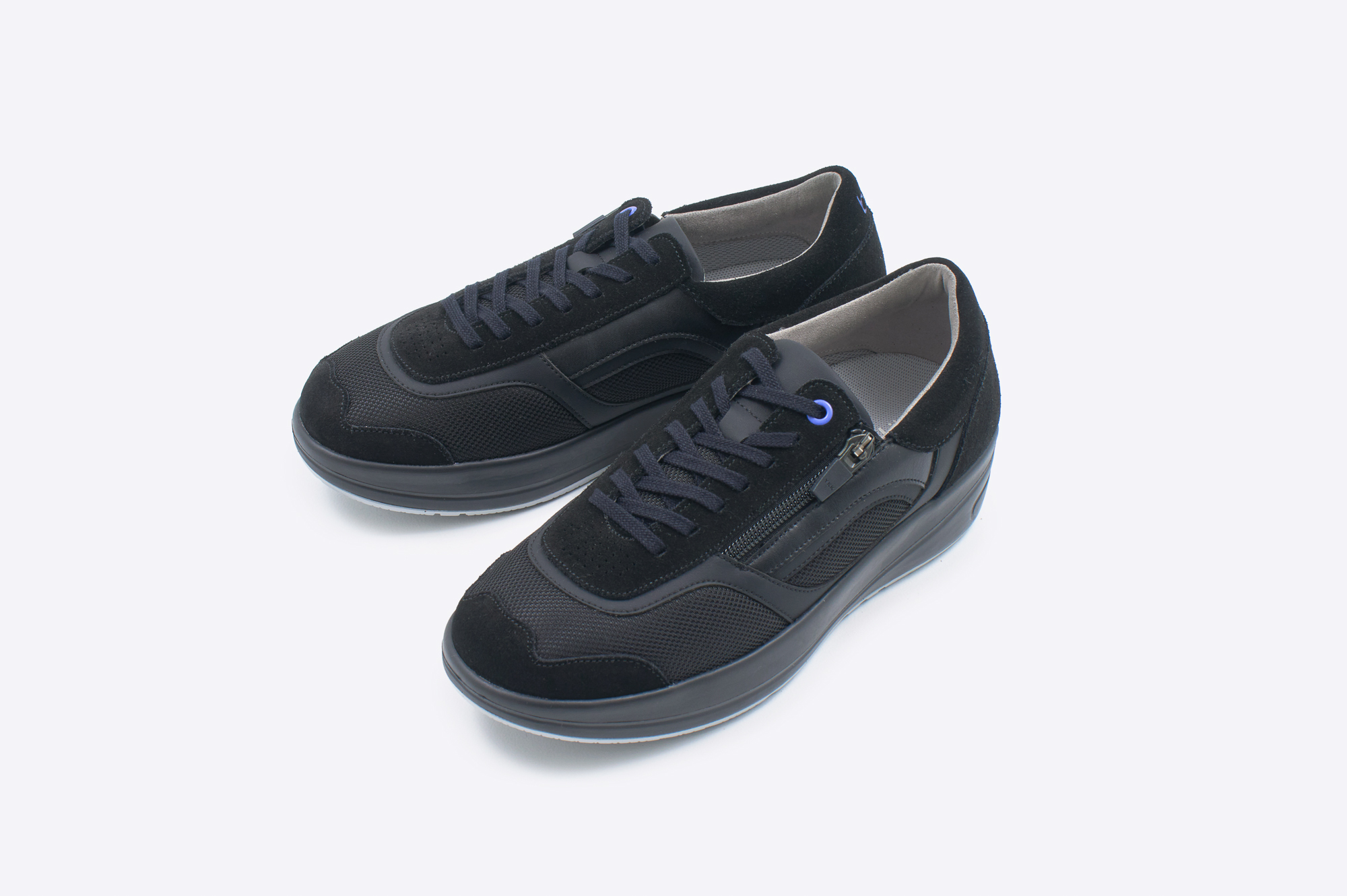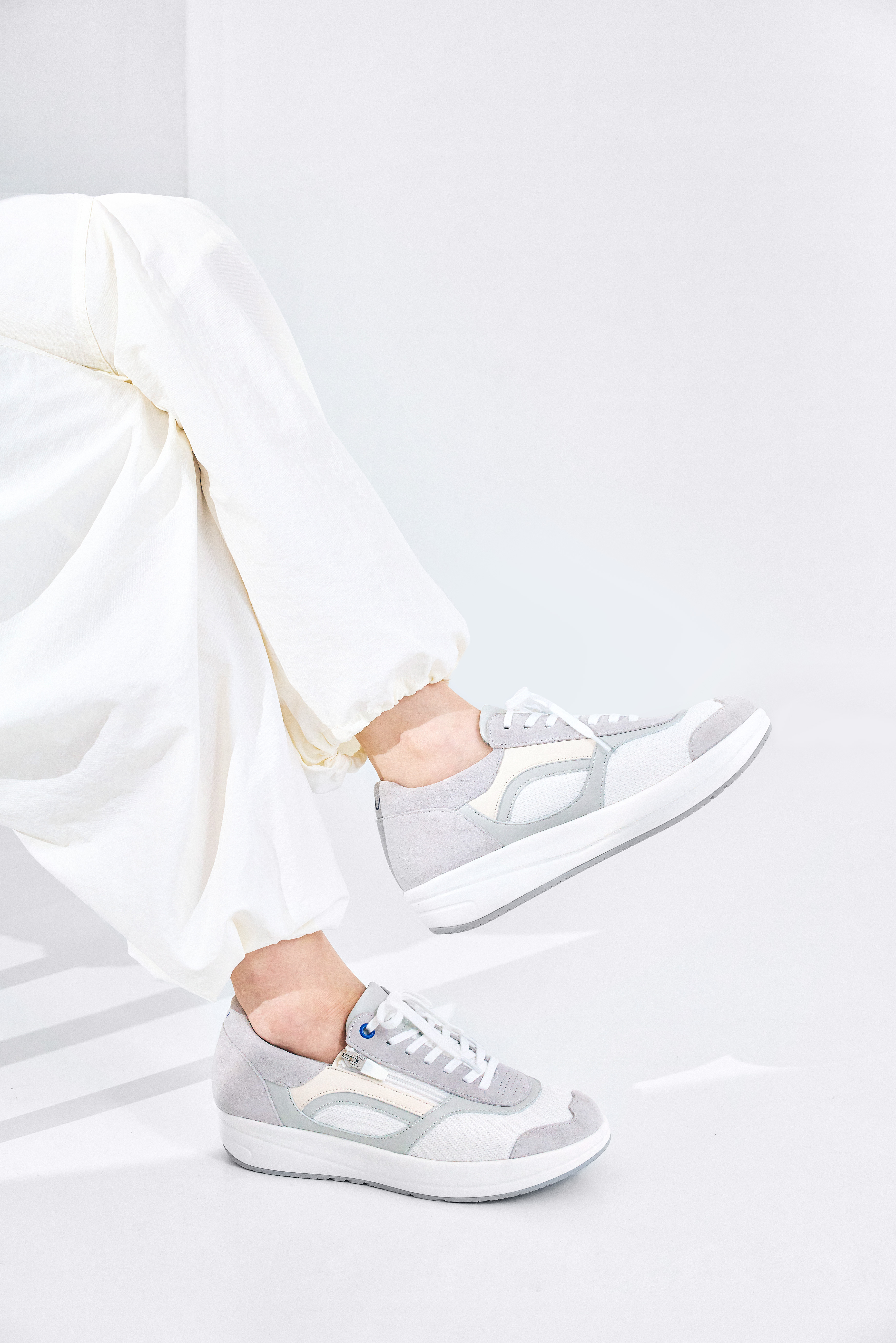 靴幅の広さを感じさせず、少しずつトーンの違うパーツを組み合わせた凝った印象のデザイン。