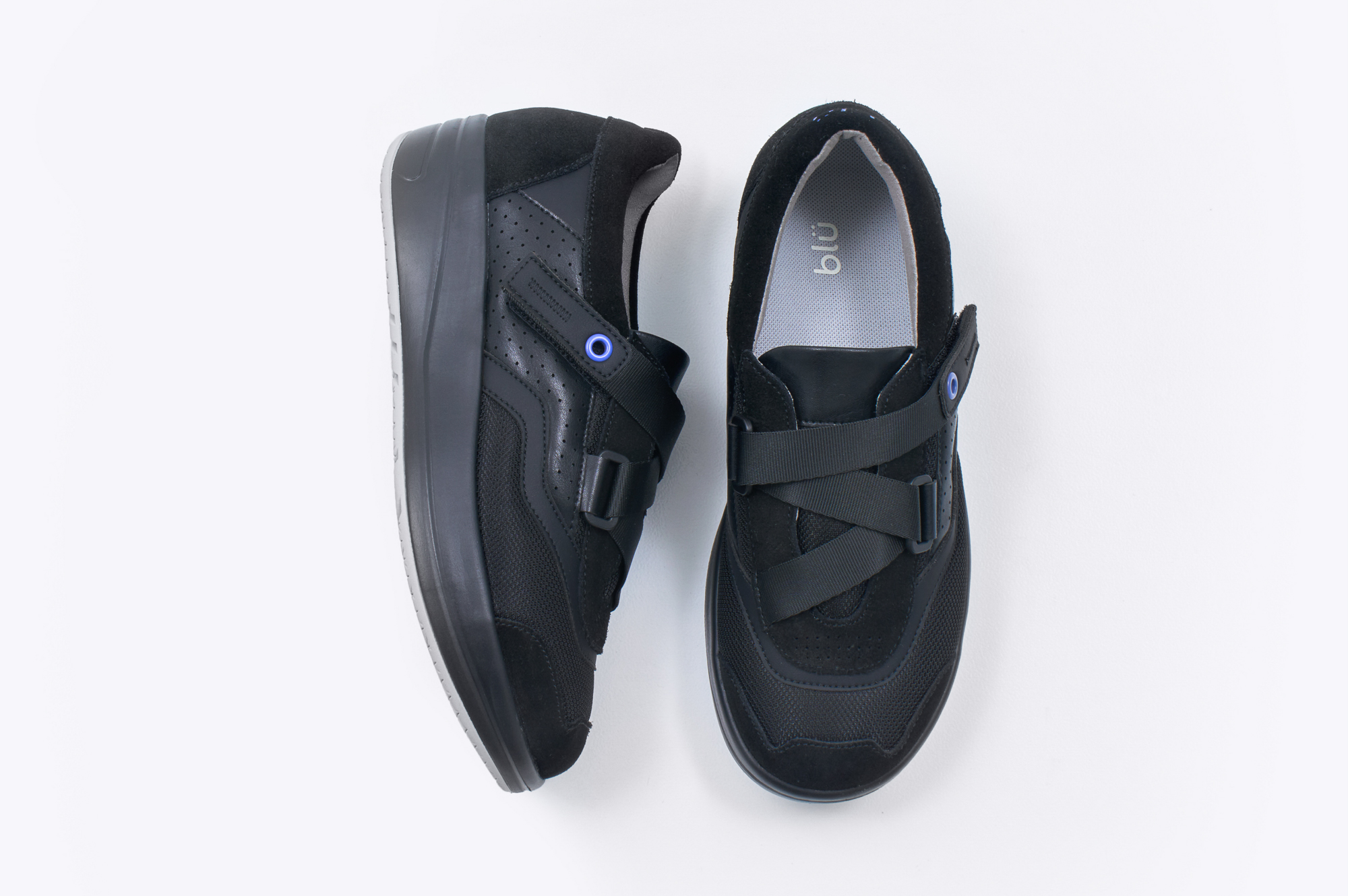 ひと続きのベルトは片足でさっと着脱可能で、