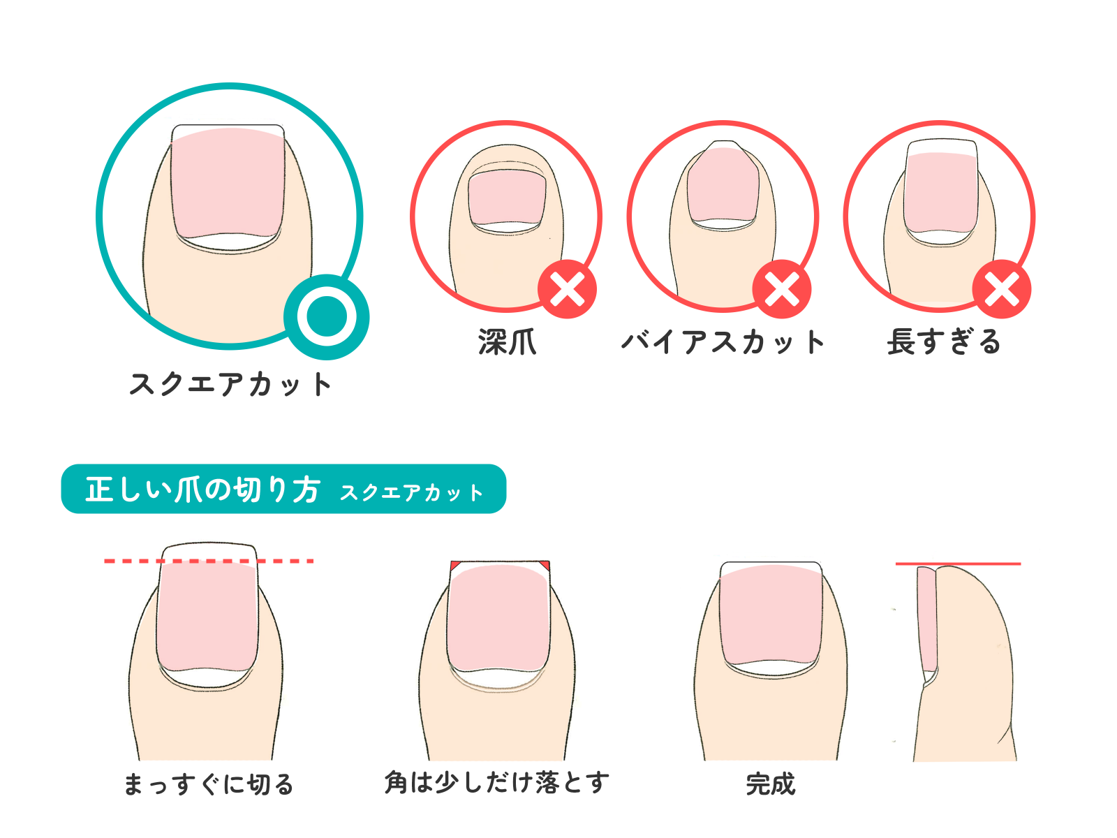 正しい爪の切り方は、「スクエアカット」とよばれ、四角に切ります。足指の先端と同じか、やや長め(1mm以内)の長さにまっすぐ切ります。爪の両端の角は尖らないように、やすりで少し丸めるように整えます。コツは、刃先がストレートになっている爪切り(一般的な平型爪切りやニッパー型爪切りなど)で、一度に切るのではなく、少しずつ切っていくことです。また、やすりはゴシゴシ動かすのではなく、爪の左右両端から中央へ一方向に動かしましょう。最後にやすりで爪の先端を上から下へなでるように優しく動かし仕上げます。